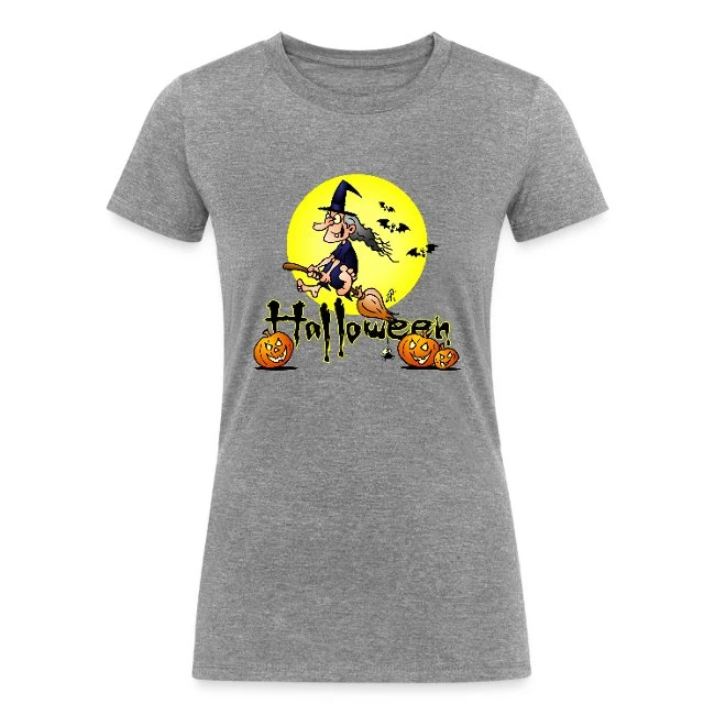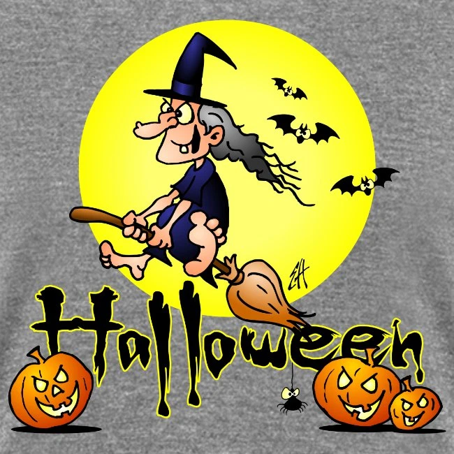 Halloween, Witch On A Broom, Bats And Pumpkins Heather Gray